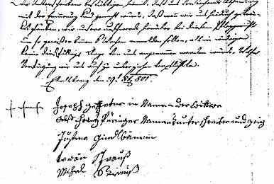 Die Kopie stammt aus einer Verlassenschaftsabhandlung aus dem Jahre 1801. Joseph Zehetner hat im Namen einer Witwe mit 3 Kreuzen unterschrieben. Franz Pühringer hat als "Namensschreiber" bezeugt, dass die 3 Kreuze wirklich von Joseph Zehetner stammen. Die anderen konnten ihren Namen bereits schreiben. Nur Urban Strauss tat sich noch etwas schwer mit der Niederschrift seines Vornamens.