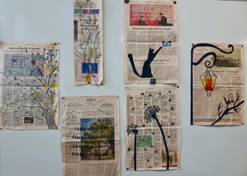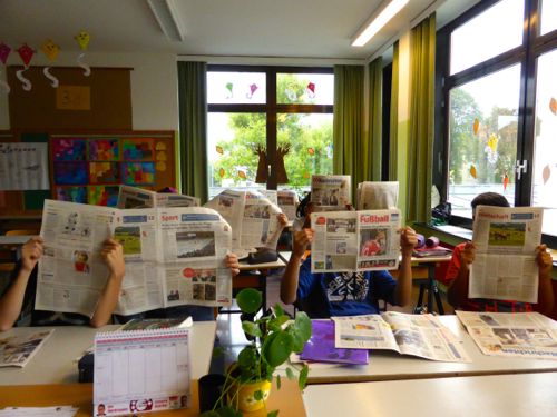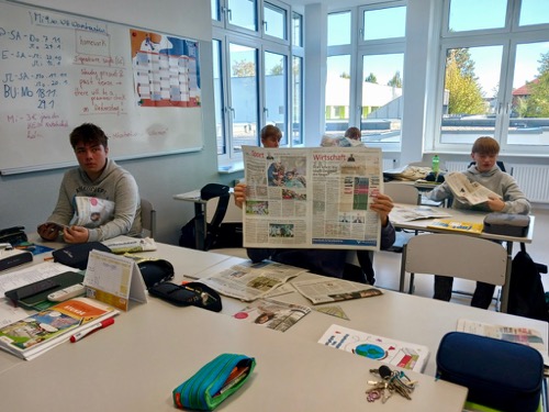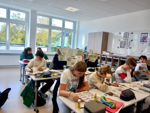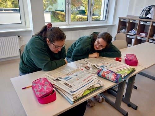 SchülerInnen der Deutschgruppe III machen sich über die Zeitung her.