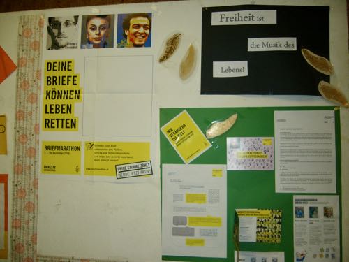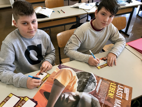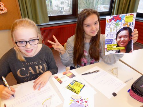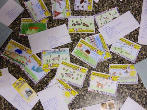 Ein Mann und eine Frau sind eingesperrt, weil sie sich für Versammlungsfreiheit, Demokratie und Bildung einsetzen. Weil die Gefangene in Myanmar eine Tierfreundin ist, haben die SchülerInnen Tiere auf die Postkarten gezeichnet. Es soll für sie eine briefliche Ermutigung sein.