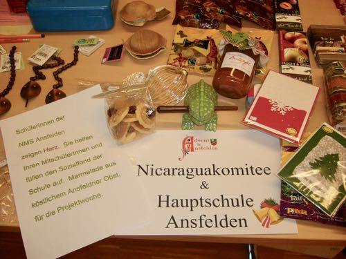SchülerInnen der NMS Ansfelden und Kinder der vierten Klassen der VS Ansfelden verkauften beim Ansfeldner Weihnachtsmarkt Lebkuchentropfen. Die Körbe waren rasch geleert und die Geldbörsen gefüllt mit schweren Münzen. Ein Euro = 10cm Wasserleitung für die Partnerstadt Condega in Nicaragua.