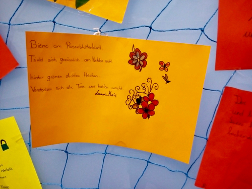 Müll-Elfchen aus dem Deutschunterricht der 1a und 1b zeigen den Müllwahnsinn auf.Das Lesebuch zur Nachhaltigkeit mit dem Gedicht Das Böse“ von Eugen Roth hat die SchülerInnen angeregt, selber Elfchen zu probieren.