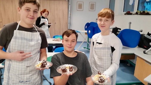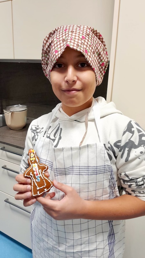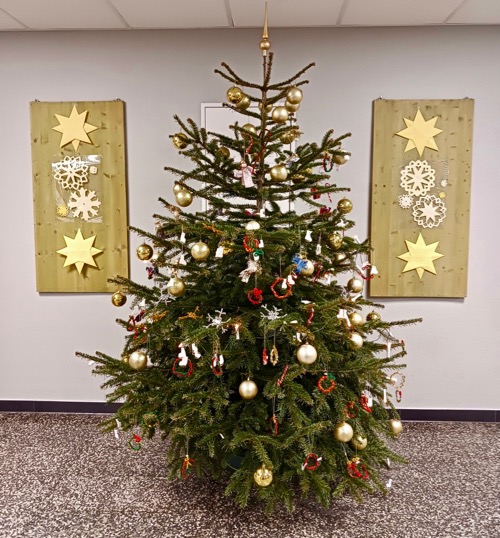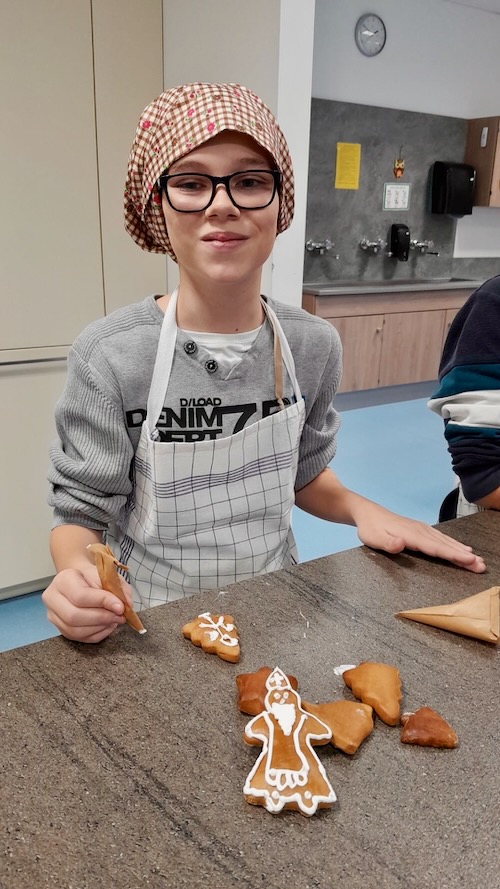 Nein, es sind die Kinder, die da freudig lärmen und backen und klopfen. Es werden im Fach Ernährung und Haushalt köstliche Schnitzerl paniert und gebraten, als Dessert finden sich süße Zapfen mit Vanilleeis ein. Ein paar köstliche Lebkuchen und Keksen dürfen auch ausgestochen, verziert und mit nach Hause genommen werden. Köstliches Weihnachtsessen mit Nachahmungseffekt! Mit diesen Unterrichtseinheiten und köstlicher Kochpraxis freuen sich die SchülerInnen ganz besonders auf die kommenden Weihnachtsferien.Das Schulhaus ist mit feinen Ornamenten passend zur Advent- und Weihnachtszeit geschmückt.
