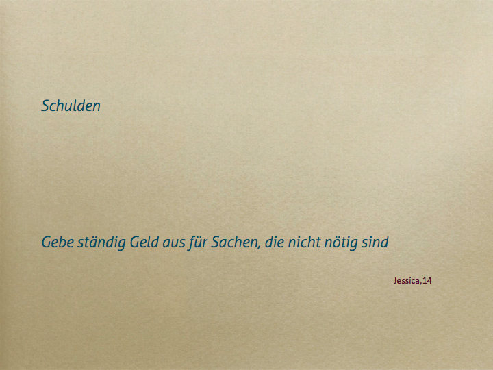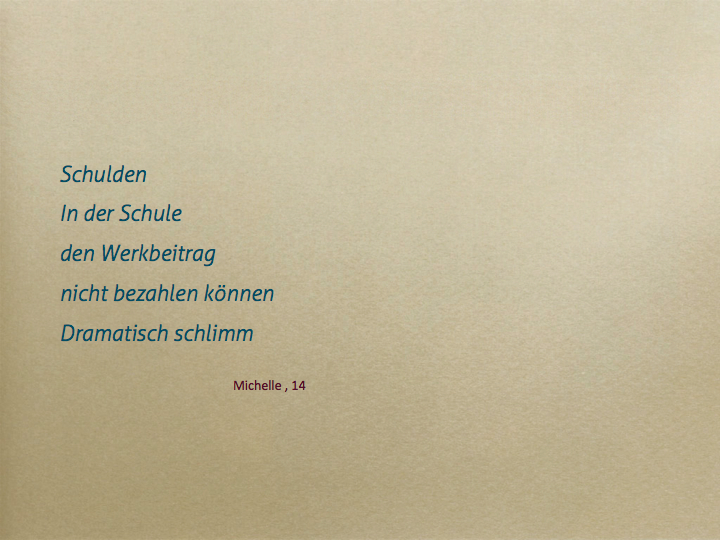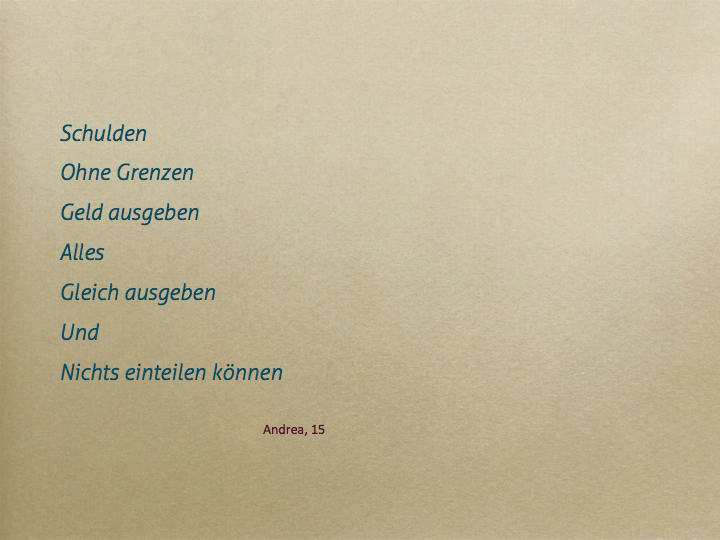 Die SchülerInnen der Informatik-HS Ansfelden setzten sich fächerübergreifend sehr kritisch mit Verschuldung, Armut und deren Folgen für Kinder, Jugendliche und Erwachsene auseinander. Die Arbeiten wurden im Rahmen einer Fachtagung der Schulnerhilfe OÖ in Linz präsentiert. (s.u. den Beitrag "Maßvoll im Maßlosen")