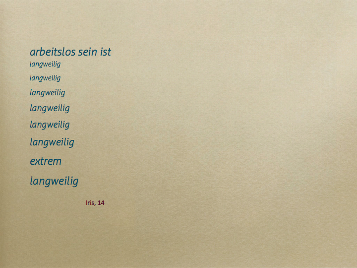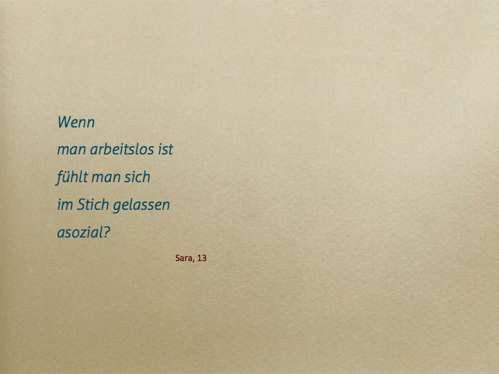 Dabei ist ein Movie mit den Inhalten Schulden, Arbeitslosigkeit und Sorgen entstanden, ebenso fanden sehr persönliche Reflexionen im Umgang mit Geld, Statistiken und künstlerisches Arbeiten mit Draht statt.