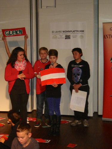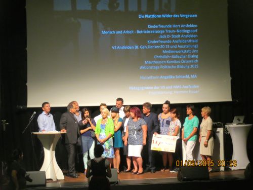 Mit großer Freude haben die SchülerInnen, Eltern, LehrerInnen und die Plattform "Wider das Vergessen" diesen Preis der Volkshilfe OÖ für gelungenes Zusammenleben entgegengenommen.Im Unterricht wurde am Beispiel des Todesmarsches vom KZ Mauthausen nach Gunskirchen und bei Zeitzeugengesprächen die Schrecken des Zweiten Weltkrieges merk.bar erarbeitet. Die Lokalhistorikerin Angelika Schlackl hat in acht Workshops die SchülerInnen dabei unterstützt. Viele der Kinder beider Schulen leben in Familien, die selber eine Flucht- und Vertreibungsgeschichte in jüngster Zeit erlebten und noch immer erleben müssen.