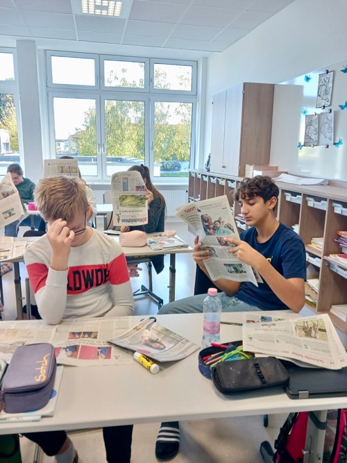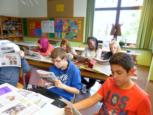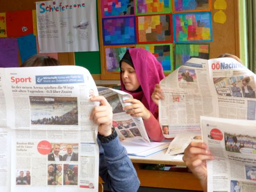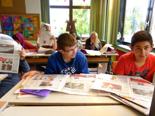 SchülerInnen der Deutschgruppe III machen sich über die Zeitung her.