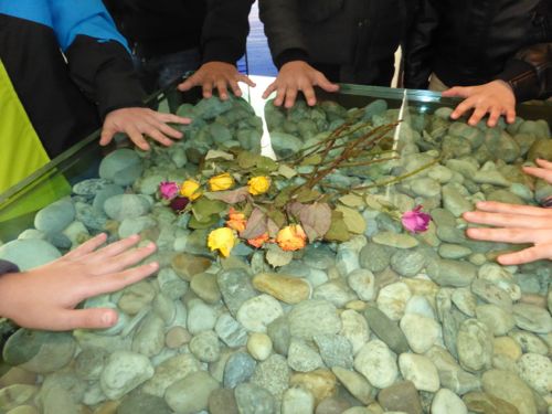 Die Materialien stehen für die Täter und die Opfer der Zeit des Nationalsozialismus vor 70 Jahren. Die SchülerInnen sehen die ausgegrabenen Fundgegenstände der beeinträchtigten Menschen: das Taschenmesser, die verrostete Brille, die kleine Puppe, die alte Niveadose - gefunden unter grauer Asche. Die Asche der Verstorbenen. Die historischen Fakten sind sichtbar und dargelegt. Über die Frage, wie das heute mit den Ausgrenzungen ist, wird noch nachgedacht ...
