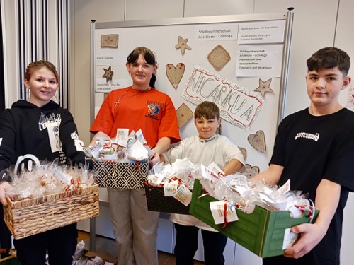 SchülerInnen der NMS Ansfelden und Kinder der vierten Klassen der VS Ansfelden verkauften beim Ansfeldner Weihnachtsmarkt Lebkuchentropfen. Die Körbe waren rasch geleert und die Geldbörsen gefüllt mit schweren Münzen. Ein Euro = 10cm Wasserleitung für die Partnerstadt Condega in Nicaragua.