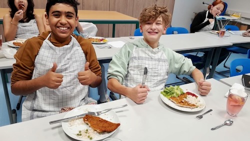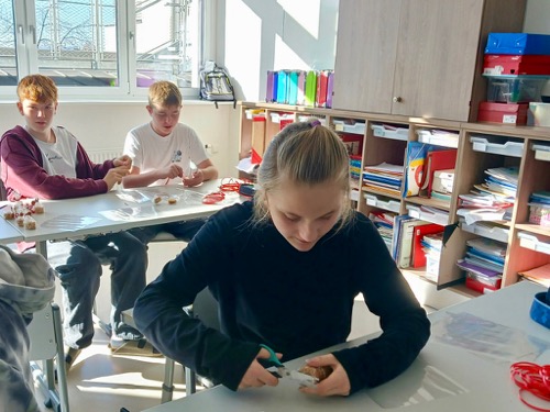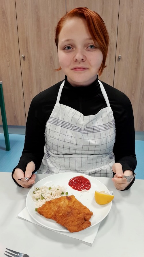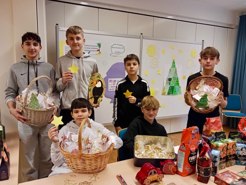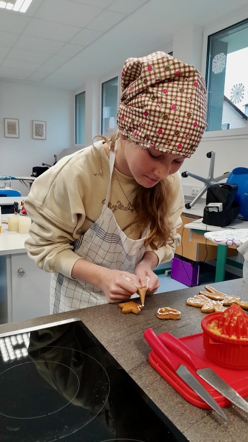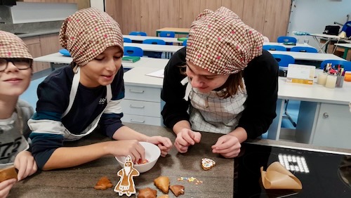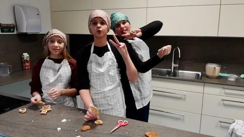 Nein, es sind die Kinder, die da freudig lärmen und backen und klopfen. Es werden im Fach Ernährung und Haushalt köstliche Schnitzerl paniert und gebraten, als Dessert finden sich süße Zapfen mit Vanilleeis ein. Ein paar köstliche Lebkuchen und Keksen dürfen auch ausgestochen, verziert und mit nach Hause genommen werden. Köstliches Weihnachtsessen mit Nachahmungseffekt! Mit diesen Unterrichtseinheiten und köstlicher Kochpraxis freuen sich die SchülerInnen ganz besonders auf die kommenden Weihnachtsferien.Das Schulhaus ist mit feinen Ornamenten passend zur Advent- und Weihnachtszeit geschmückt.