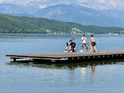 Leon: Nach Beachvolleyball mussten wir unsere Füße im See waschen.