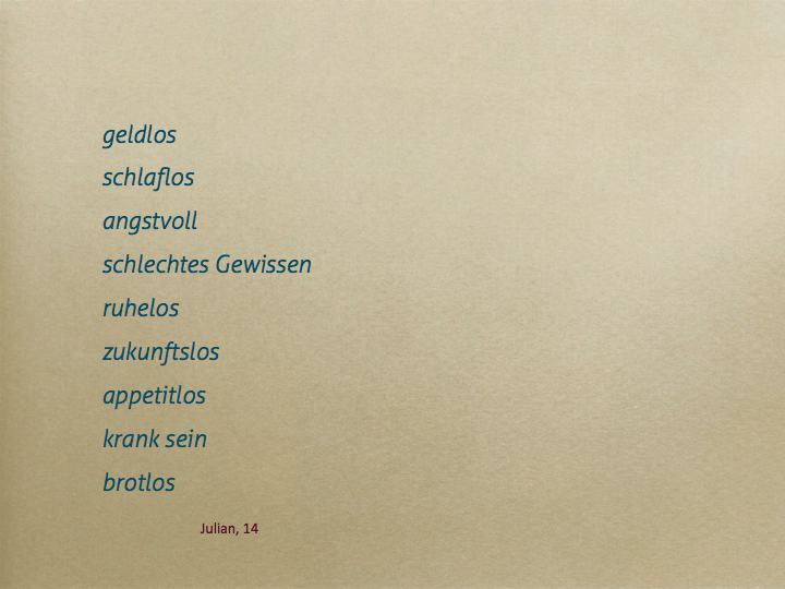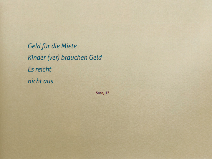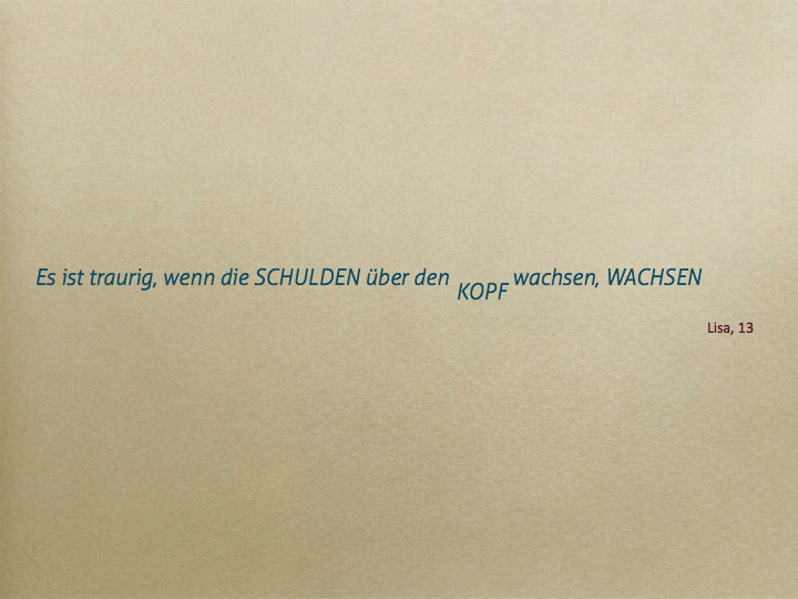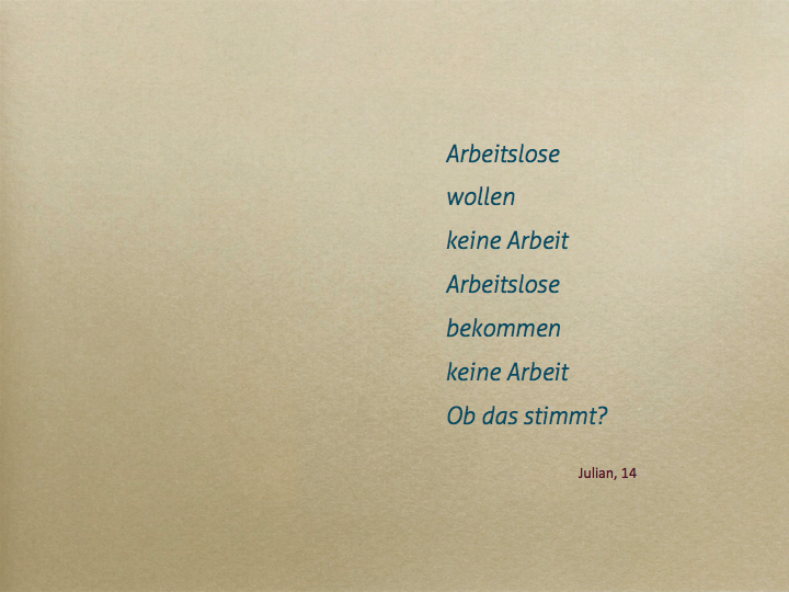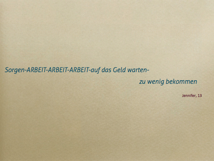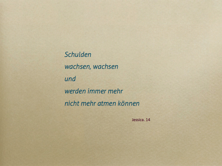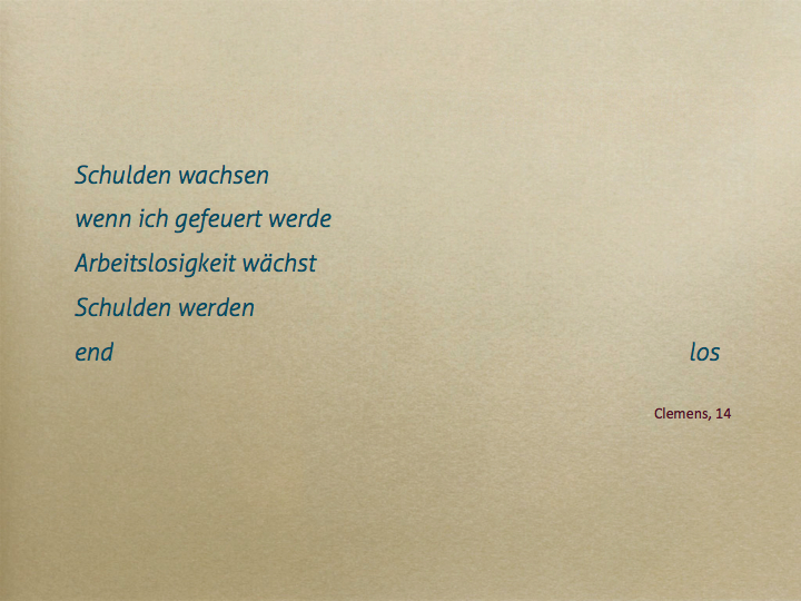 Dabei ist ein Movie mit den Inhalten Schulden, Arbeitslosigkeit und Sorgen entstanden, ebenso fanden sehr persönliche Reflexionen im Umgang mit Geld, Statistiken und künstlerisches Arbeiten mit Draht statt.