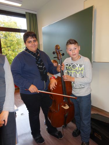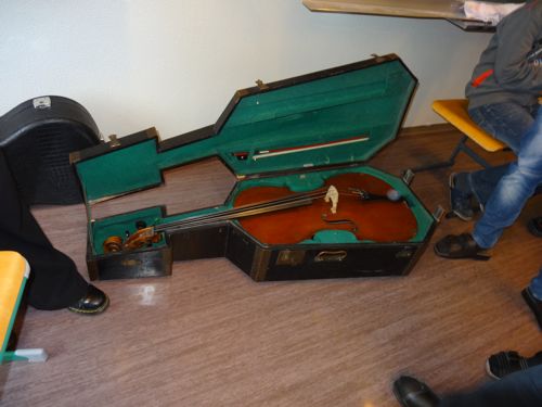 Koffer öffne dich! Und siehe da, aus dem alten schwarzen und sehr schweren Holzkoffer kommt ein voll funktionstüchtiges Cello zum Vorschein! Die Schülerinnen und Schüler der dritten Klassen staunen nicht schlecht und haben große Freude am Angreifen, Spielen und Erforschen des Instruments.Doch das war noch nicht alles! Koffer öffne dich! In dem zweiten, unscheinbaren rechteckigen Koffer liegen die Teile einer Blockflöte, und was für einer! Diese Großbassblockflöte ist größer als die Musiklehrerin! Da lassen sich die Schülerinnen und Schüler der ersten und zweiten Klassen nicht zweimal bitten und bestaunen und betasten das seltene Instrument.