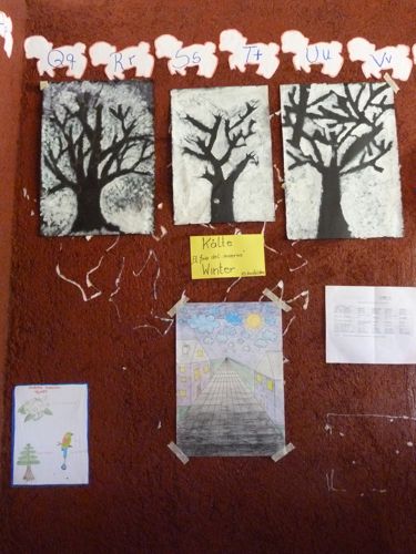 Die SchülerInnen aus Ansfelden präsentieren Arbeiten aus dem Schulfach "Bildnerische Erziehung": der Traktor auf dem Feld, der kahle Baum im Winter, abstrakte Kälte, Haarpracht der Österreicherin; Bienen und Farbenspiel des Frühlings.